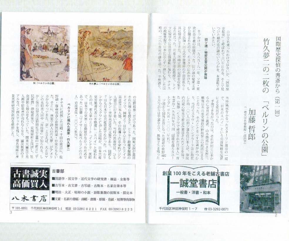 詳しくは、ウェブ上の加藤HP「ネチズンカレッジ」(https://netizen.jp)に収録した、「ドイツ・スイスでの竹 久夢二探訪記」(『平出修研究』第32集、2000年)、「島崎蓊助と竹久夢二──ナチス体験の交錯』(桐生『大川美術館・友の会ニュース』第49号、2002年)などで論じたが、右側の女の子が玩具を引く絵は、夢二郷土美術館では「小公園」としている。当時ベルリン大学美学生で後に昭和天皇侍従長になった徳川義寛が、おそらく夢二の滞独生活援助のために買い持ち帰った。多くの画集に収録され郵便切手にもなった左の絵は、画商の手を経ている。同じくベルリン大学学生で国崎・千田らの革命的アジア人協会で反ナチ運動に加わった八木誠三(名古屋丸栄百貨店の御曹司)か井上角太郎(在独日本商務官事務所助手で恋人はユダヤ人)から画商に渡った可能性がある。ひろた・袖井氏はコロナ禍で亡くなった。若い歴史家・美術史家の再挑戦を期待する。
