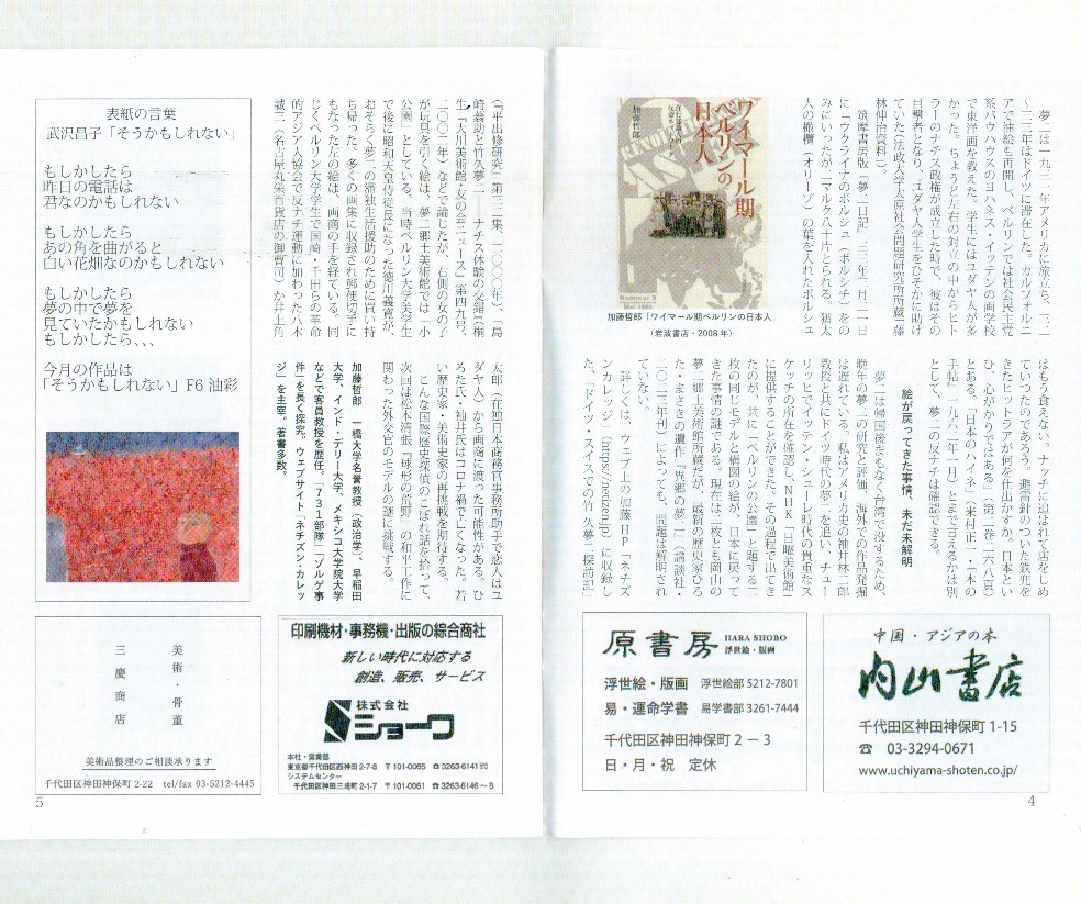 ● 「ネチズンカレッジ」移転・改築に当たって、東京神田・神保町・御茶の水の地域交流タウン誌『新・本の街』 とタイアップして、「国際歴史探偵の書斎から」と銘打ち、この間の現代史・インテリジェンス研究の未解決の謎を連載することにしました。主に留学・出張・外遊・洋行・探検・亡命などで海外に出た日本人の、文化・芸術関係の歴史にまつわる問題を、エッセイ風に書き残します。