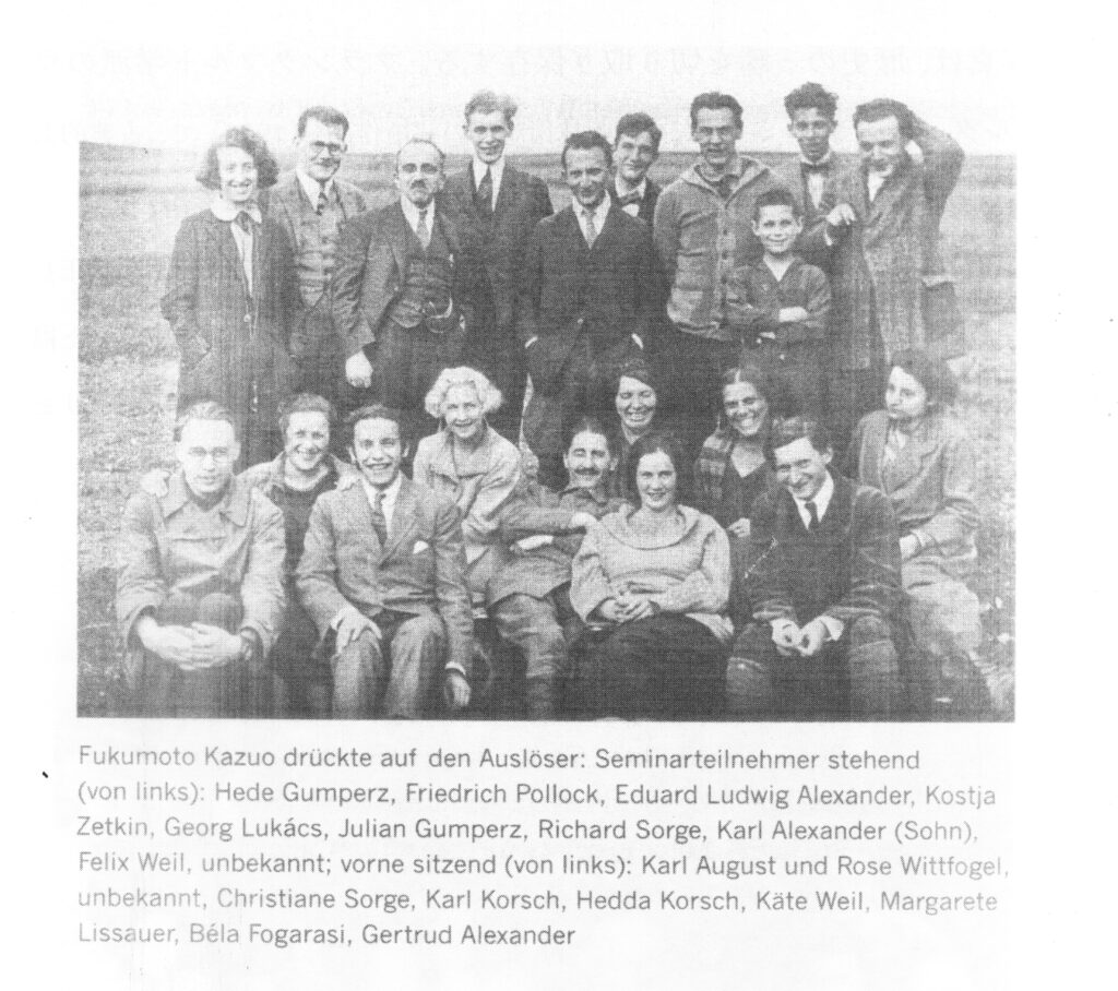 上の写真に写っているのは、左からヘーデ・グンペルツ、フリートリヒ・ポラク(法学者)、エドアルト・ルートヴィヒ・アレクザンダー、コスタ・ツェトキン[クララ・ツェトキンの息子]、ゲオルグ・ルカーチ、ジュリアン・グンペルツ、リヒアルト・ゾルゲ、カール・アレクザンダー(息子)、フェリクス・ヴァイル、氏名不詳、と解読されている。