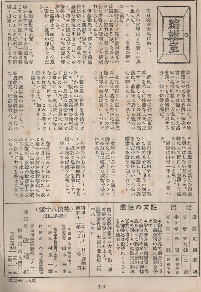 ● ここにでてくる『文藝』8月号「編集後記」の現物が、信州南木曾の勝野家に残されていた。小川五郎=後の高杉一郎の筆になるかは確定できないが、文壇の「新しい風」として、「勝野氏はソ連に数年滞在の後帰れる若き作家、そのみずみずしい筆力は、希に見る清新な描写力と溌剌とした構成力示している」と作家としての力量を一緒にデビューした伊藤整と共に認め、その素材であるソ連の現実についても「ソ連の嵐は世界を戦慄させた」と評していた。日中戦争期でも、文学者・編集者の壊れていない鏡には、ジイドや勝野の表現がリアルに見えていた。見えないのは、百合子の「党派性」の眼鏡によるものだった。